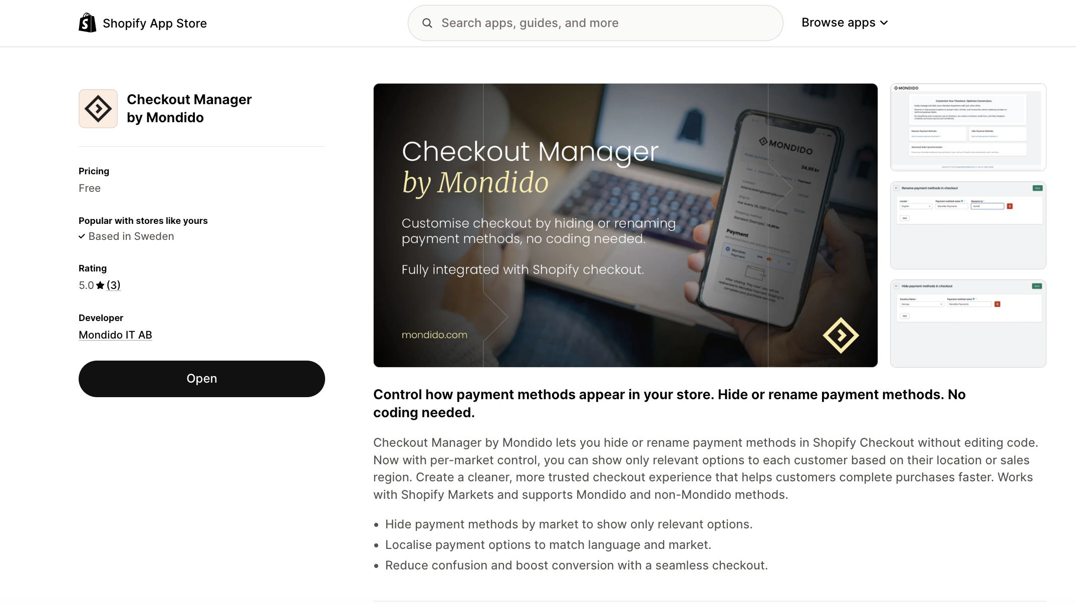 Start by downloading our app "Checkout Manager by Mondido" here. Click on Open app. The app is free to install and use.