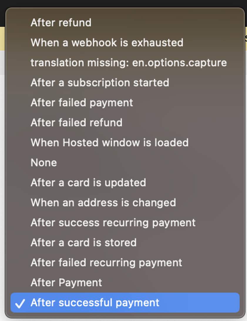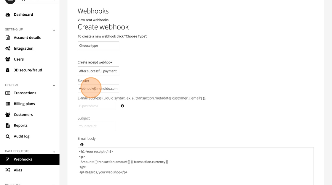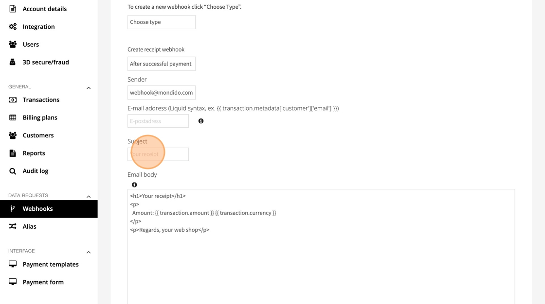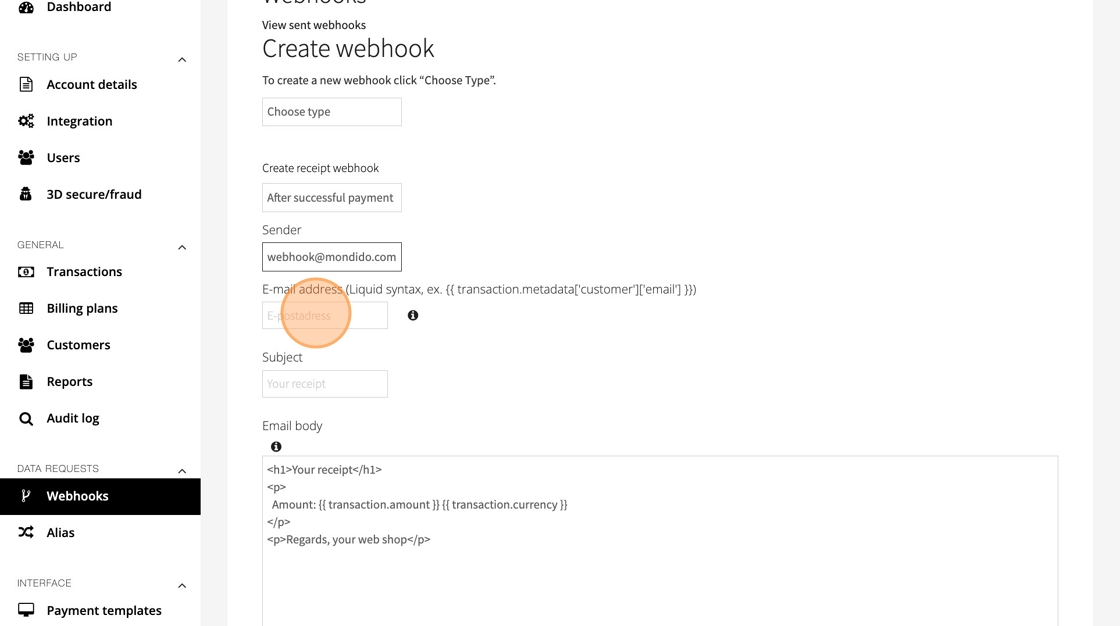 Under Create webhook, click Choose type and select Receipt from the dropdown.