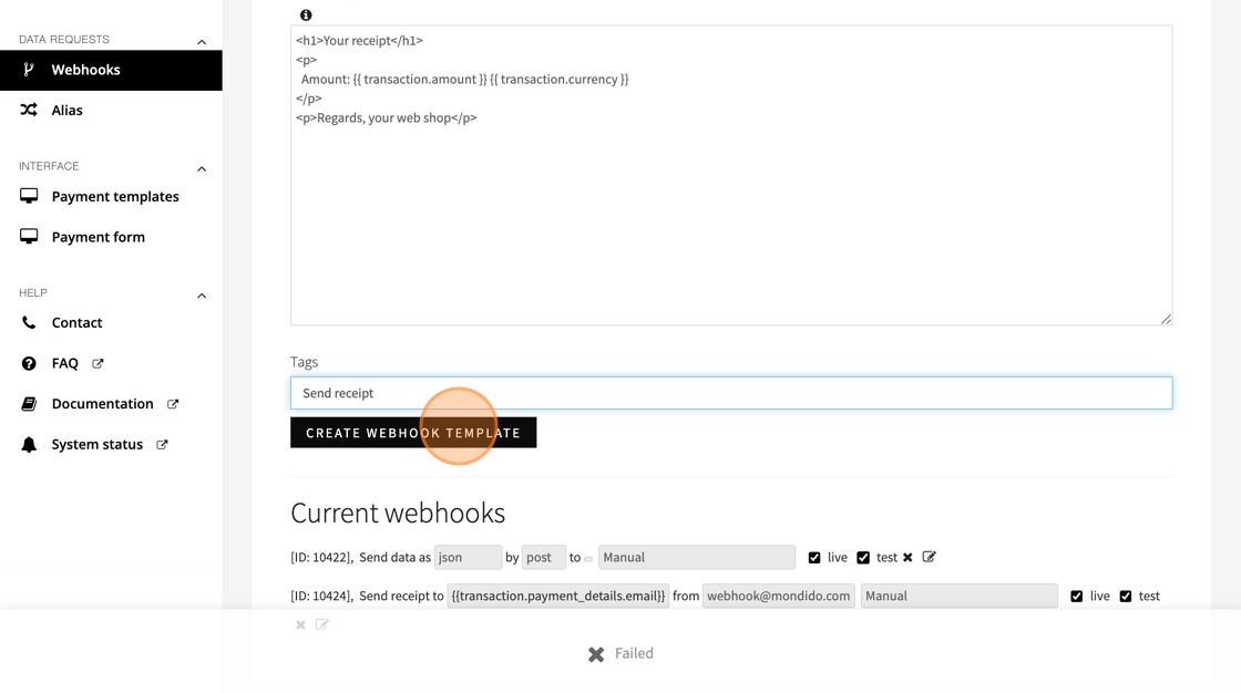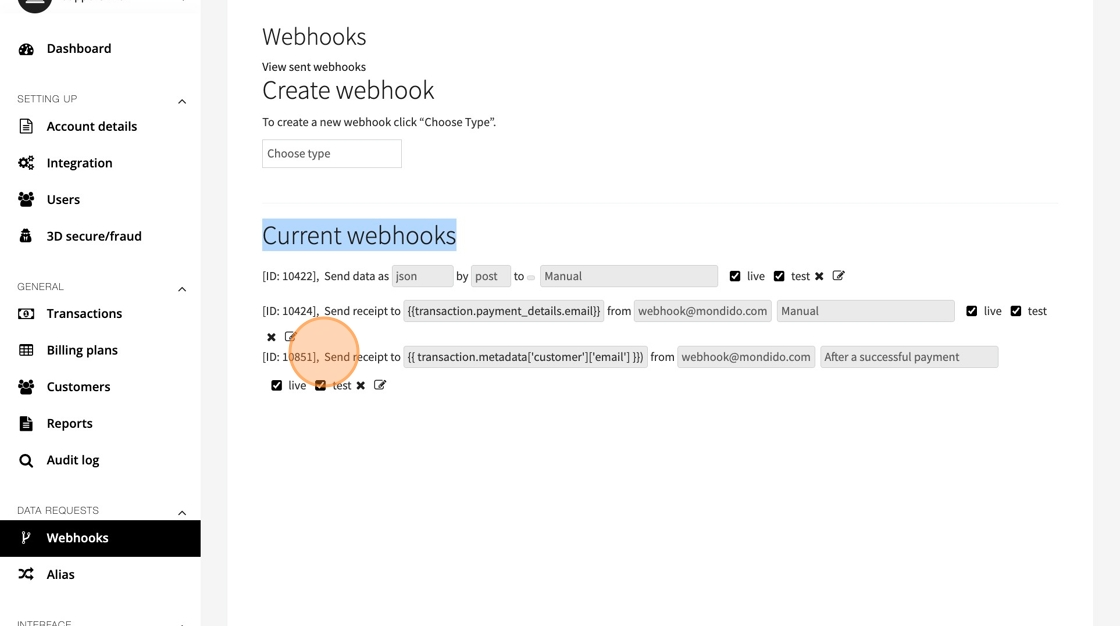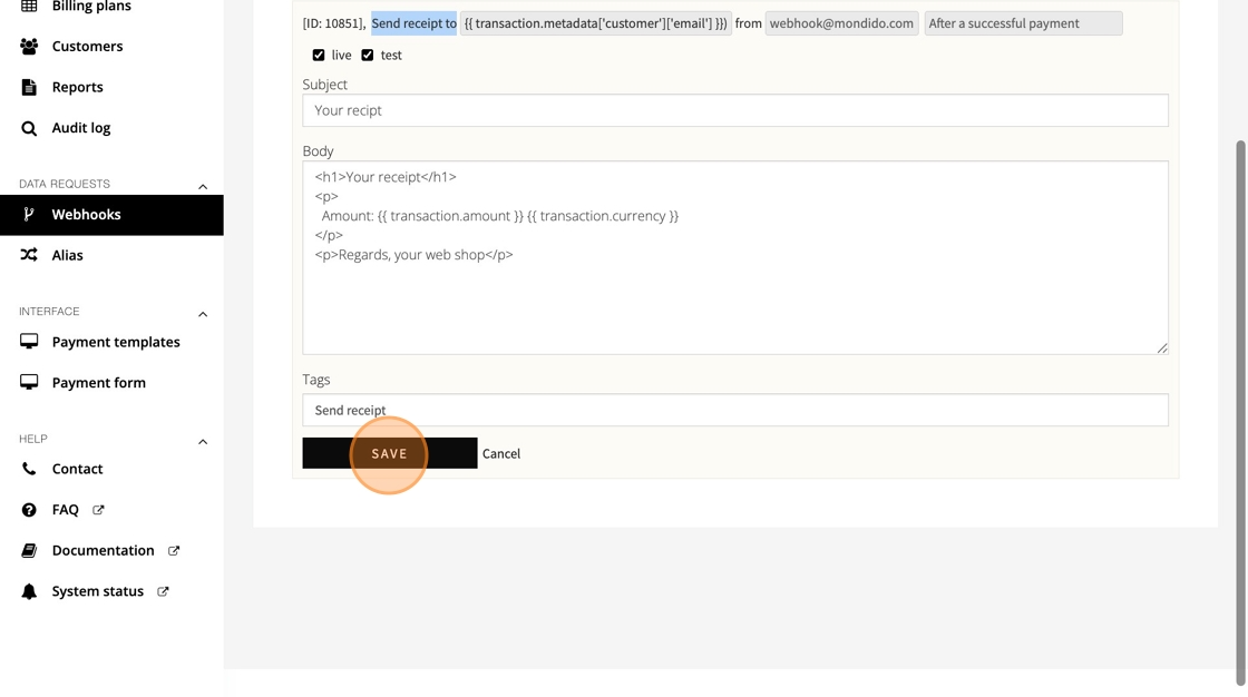 You can configure Mondido to automatically send a receipt to your customers after each successful payment. This is done using a webhook. Follow the steps below to set everything up.