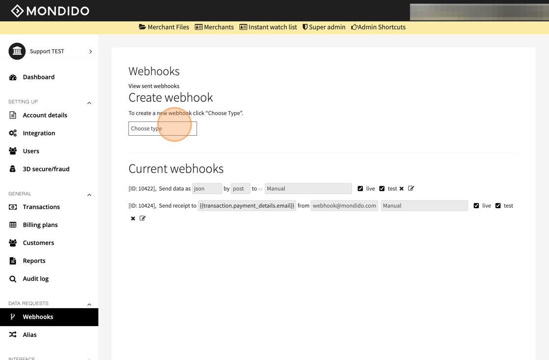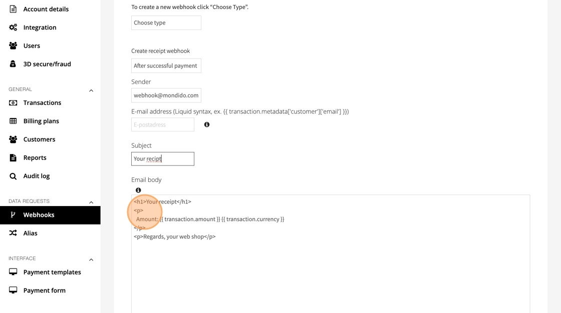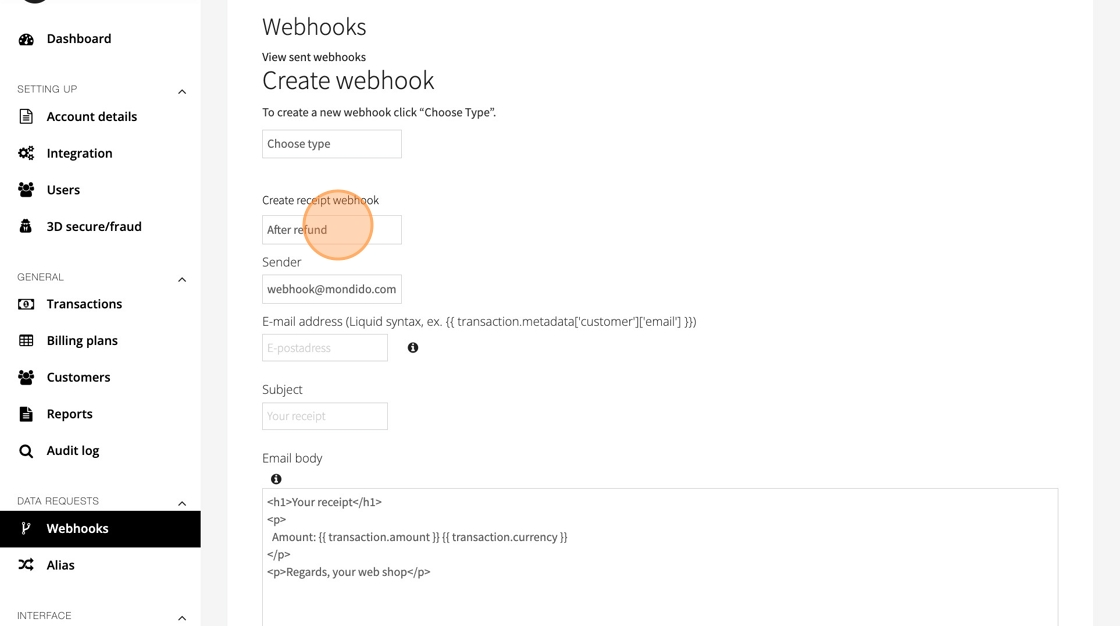 Under Create webhook, click Choose type and select Receipt from the dropdown.